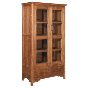 This stately reclaimed wood cabinet offers an elegant solution for showcasing your belongings. It has 2 glass doors that reveal a series of shelves, plus 2 drawers. Artistic details like brass pulls and tiered wood trim make this cabinet a special piece for any space.