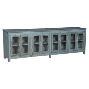 Crafted from teak and featuring 8 glass doors, this cabinet has a striking blue finish that highlights the distressed, aged appearance. A perfect choice for storing items in your living, dining, or entryway areas.