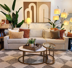 The Bronte sofa is best characterized by its timeless elegance and minimalist design. Upholstered in a neutral textured fabric, this sofa has three cushioned seats, squared armrests, and ample space for hosting or lounging.