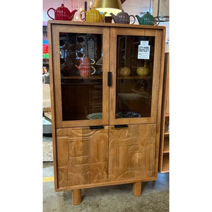 Abstract geometric carvings on the front panels of this wooden cabinet make this piece ideal as a focal point in a modern space.
