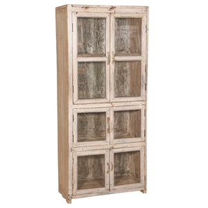 This cabinet is crafted from reclaimed wood and features 6 enclosed glass doors. Fading paint and authentic patina give this piece a sense of history. It serves as an ideal storage solution for any living, dining, or kitchen space.
