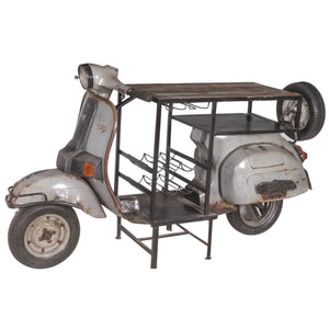 A vintage scooter is combined with wood and metal shelving to create this conversation piece. Add an eclectic touch to your space with this practical bar shelf that includes bottle and glass racks. Please note that each scooter is unique and colors and style may vary.