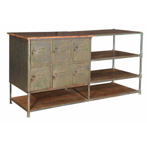 This iron locker table has a lovely patina and includes hidden storage, as well as a teak wood tabletop and open shelving. The perfect choice for adding a vintage flair to your home, this piece is versatile and can be used for both display and organization purposes.