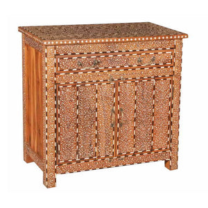 This sideboard is made with durable teak wood and detailed with bone inlay for a unique look. It is a standout piece to add to any living area with its pull-out drawers and enclosed cabinet space.