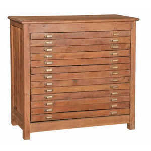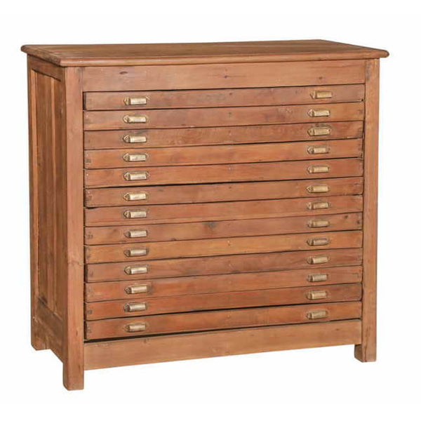 Featuring a series of apothecary-inspired drawers, this teak chest offers discrete storage for small items. The reclaimed teak wood and small brass drawer knobs make this one of a kind piece a beautiful addition to any space.