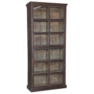 This charming vintage wooden cabinet features a dark and rustic patina. Glass cabinet doors make this cabinet ideal for adding storage to the kitchen, living room, or entryway.