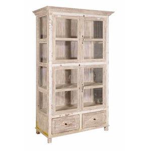 This charming wooden cabinet features a light wash and glass cabinet doors for an airy, fresh appeal. Ideal for adding storage to the kitchen, living room, or entryway.