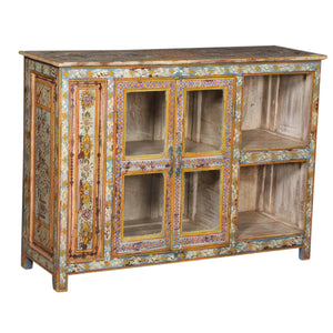 This lowboy cabinet is handcrafted from teak wood and features a hand-painted, vibrant, colorful, floral pattern with shelving storage. A stand-out functional piece!?