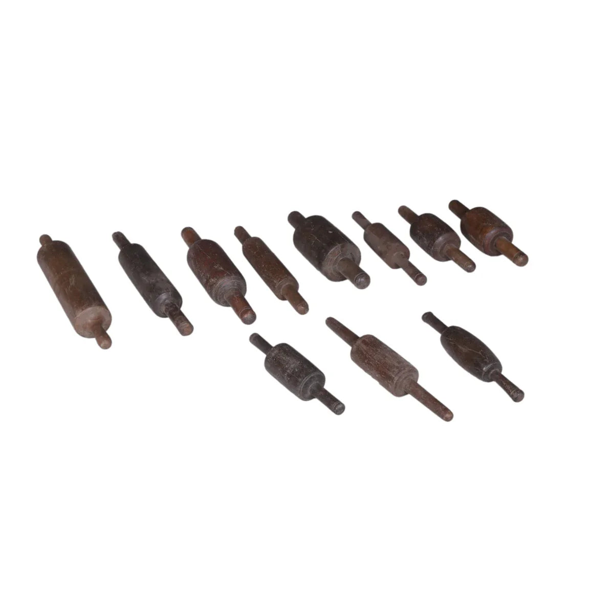 Made from teak in a dark finish, these rustic rolling pins display the wear and age of the wood.